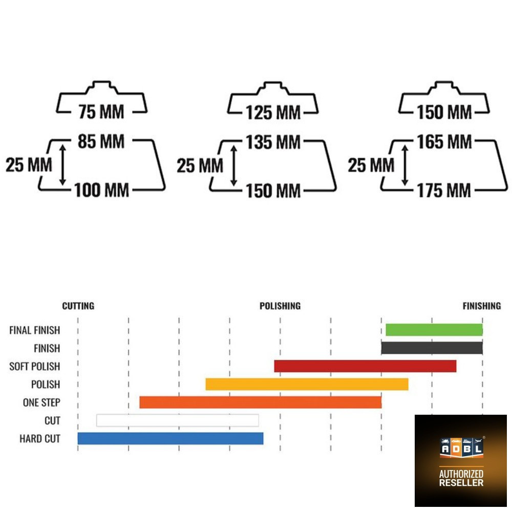 A tartótányér tépőzáras felületénél nagyobb a polírozókorong tépőzáras oldalának mérete, ezáltal könnyebb a felhelyezés és gyorsabb az eltávolítás. A különleges trapéz alakú kialakításból adódóan a munkafelület átmérője nagyobb, mint a tartótányér névleges mérete biztosítva ezzel a hatékonyabb és biztonságosabb munkavégzést.