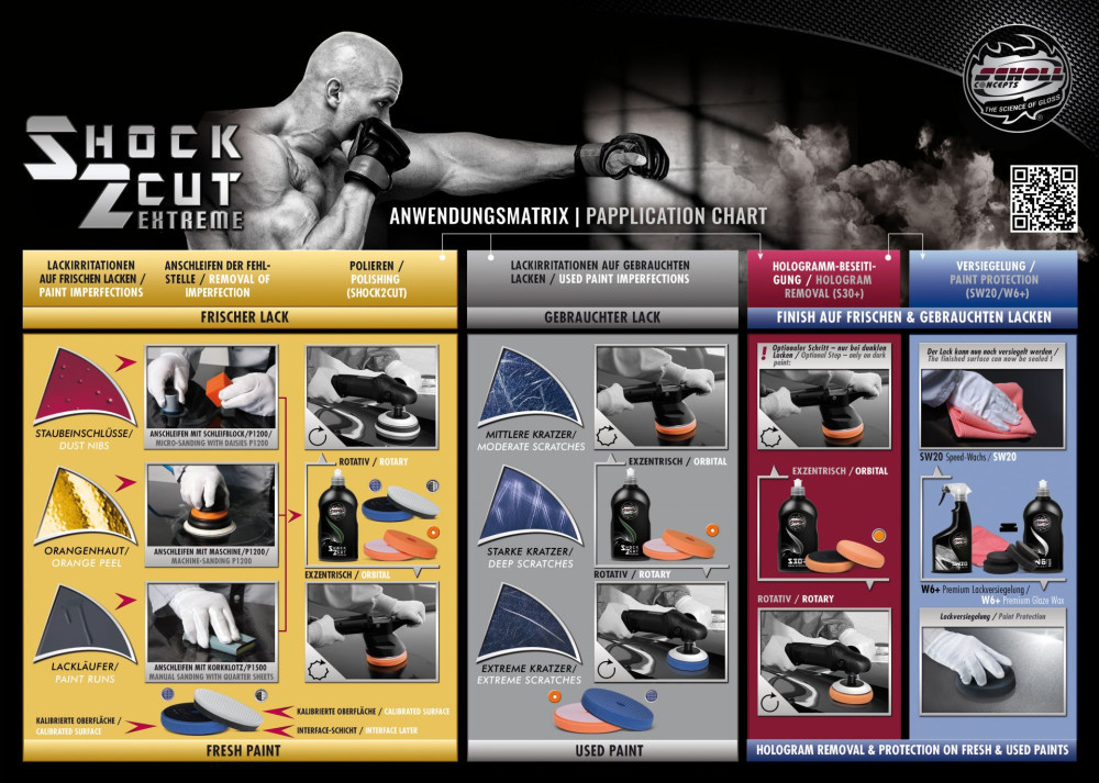 A Shock2Cut High-Performance Cutting Compound forgó- és orbitális nagylöketű polírozókon használható. A legjobb eredmény elérése érdekében javasoljuk az innovatív Sandwich-SpiderPad (fekete/fehér), a SpiderPad sötétkék, valamint a narancssárga Premium Polishing Pad használatát.