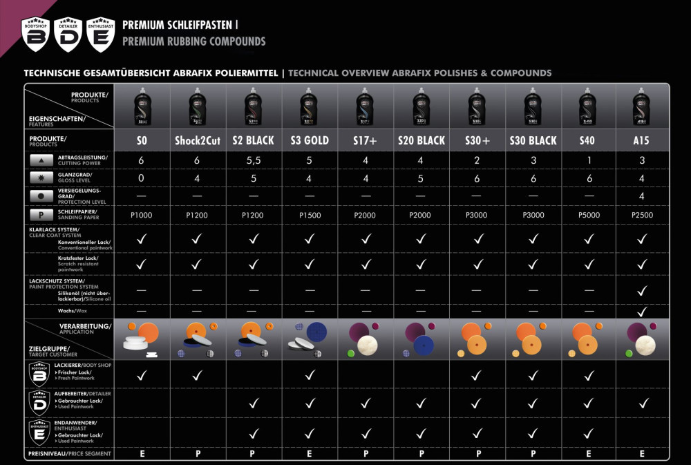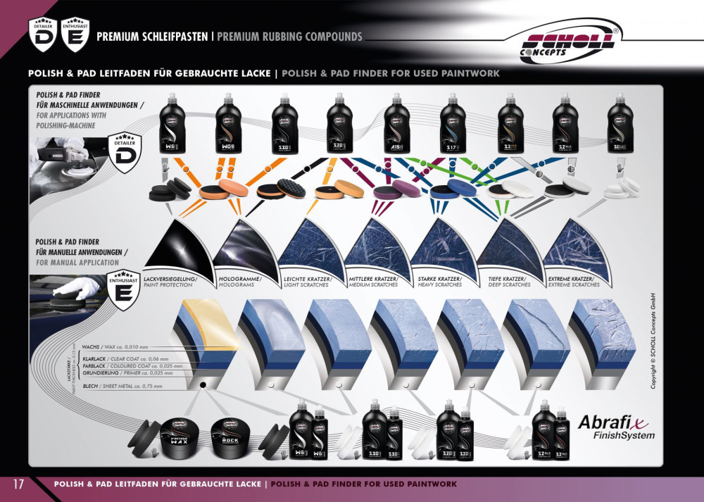 A Shock2Cut High-Performance Cutting Compound forgó- és orbitális nagylöketű polírozókon használható. A legjobb eredmény elérése érdekében javasoljuk az innovatív Sandwich-SpiderPad (fekete/fehér), a SpiderPad sötétkék, valamint a narancssárga Premium Polishing Pad használatát.
