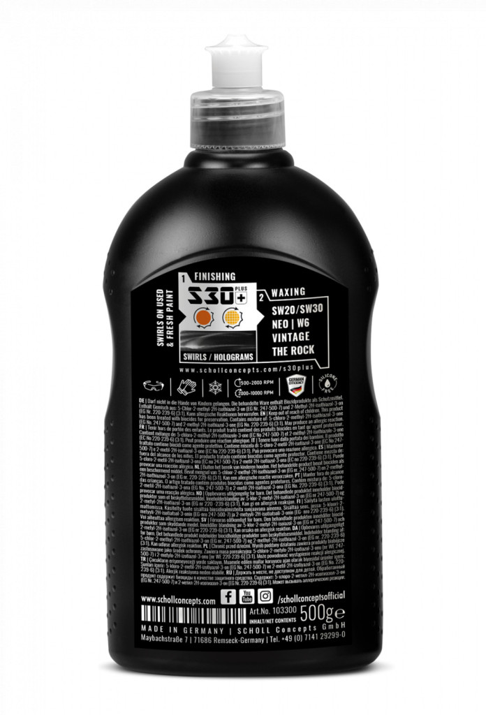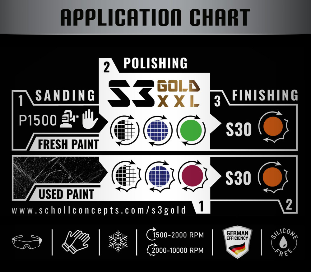 Az S30+ általában minden SCHOLL polírozó párnával felhordható. A legjobb eredmény érdekében javasoljuk az univerzális narancssárga Polírozó Pad vagy a NEO SpiderPad használatát. Az extra puha fekete betét használata nem javasolt! Az S30+ felhordható rotációs és orbitális polírozógépekkel is.