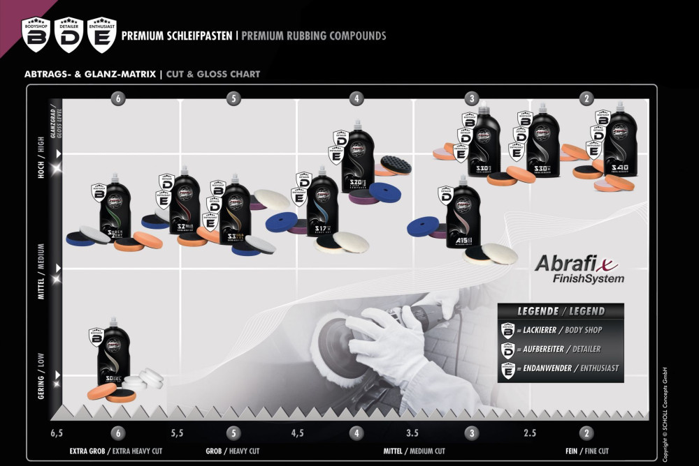 A High Performance Compound S30+ tökéletes végeredményt garantál sötét fényezésen. A mikrofinomságú, nagy tisztaságú alumínium-oxid poron alapuló egyedi összetételnek köszönhetően a fedőbevonat enyhe karcolásai és mérsékelt kopásnyomai, valamint a korábbi polírozási alkalmazásokból származó örvénylési nyomok és hologramok könnyen eltávolíthatók. hatékonyan egyetlen lépésben.